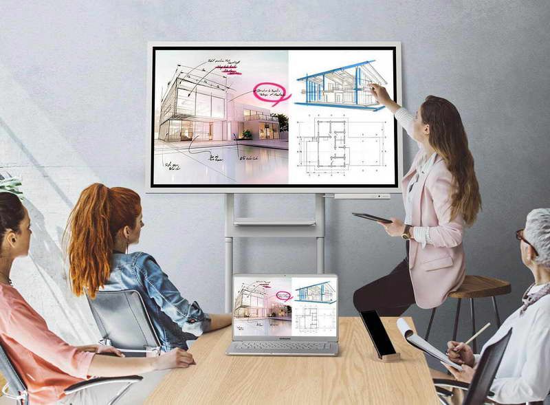 Để tăng tính tương tác, màn hình flipchart điện tử của Samsung có khả năng tương thích với nhiều thiết bị thông qua kết nối không dây và cổng USB, PC và di động. Chức năng chia sẻ màn hình tích hợp giúp nội dung trên flipchart có sẵn trên máy tính, điện thoại thông minh và máy tính bảng được kết nối mà không bị gián đoạn hoặc giảm chất lượng hình ảnh. Tương tự như vậy, người dùng cũng có thể nhập nội dung cá nhân lưu trữ lên màn hình flipchart điện tử và giới thiệu những ý tưởng mới cho cuộc thảo luận.