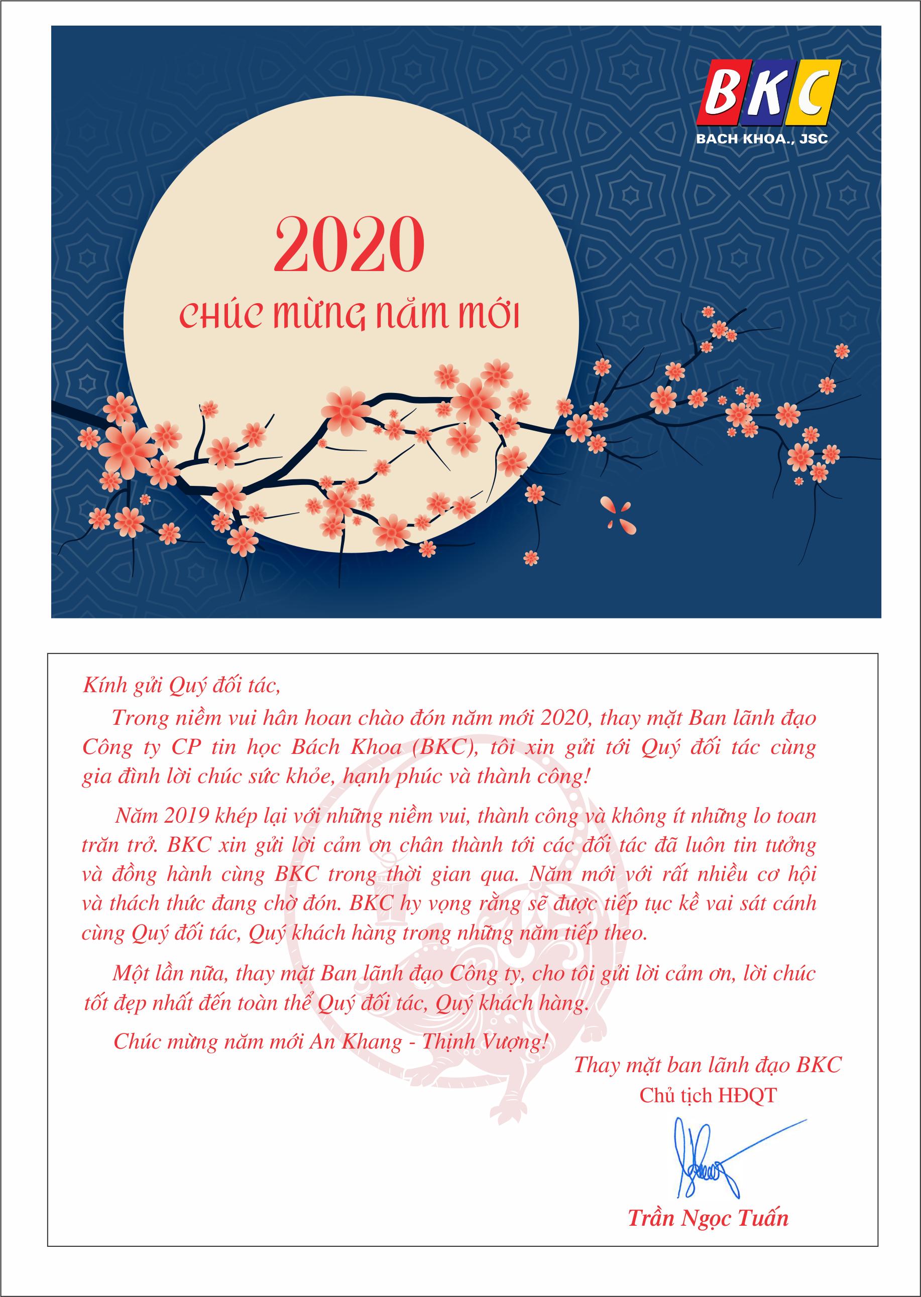 Trong niềm vui hân hoan chào đón năm mới 2020, thay mặt Ban lãnh đạo Công ty CP tin học Bách Khoa (BKC), tôi xin gửi tới Qúy đối tác, Quý khách hàng cùng gia đình lời chúc sức khỏe, hạnh phúc và thành công!