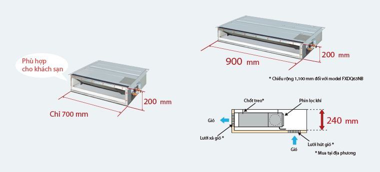 Trung bình kích thước dàn lạnh điều hòa âm trần nối ống gió 18.000 BTU - 24.000 BTU (Cao x Dài x Rộng): 250 x 1000 x 800mm