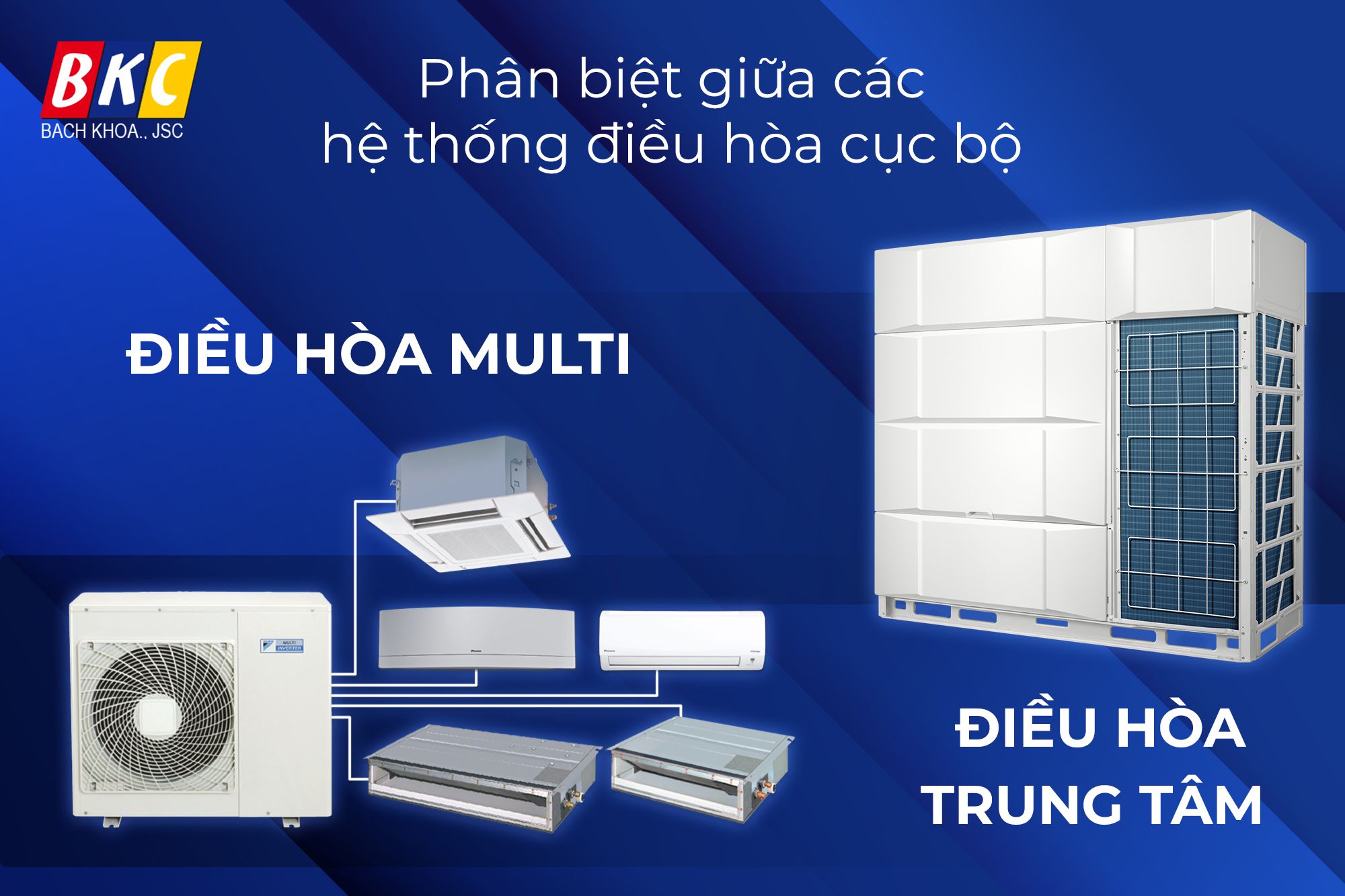 Nhiều người vẫn thường nhầm lẫn giữa hệ thống điều hòa trung tâm, điều hòa Multi và điều hòa cục bộ. Vậy 3 hệ thống điều hòa này có những điểm khác biệt gì? Trong bài viết này, BKC sẽ giúp các bạn phân biệt những hệ thống điều hòa này một cách dễ dàng.