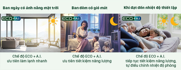 Chế độ Eco kết hợp với công nghệ AI sẽ tự động nhận biết và đánh giá đâu là mức nhiệt tối ưu cho không gian phòng, dựa trên các yếu tố: điều kiện phòng, các nguồn sinh nhiệt như ánh nắng mặt trời, các thiết bị điện tử, số lượng người trong phòng tăng lên.