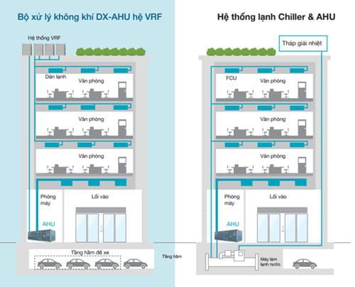 | Không gian | Không gian lắp đặt nhỏ (Chỉ bao gồm AHU và VRF) | Yêu cầu không gian lắp đặt lớn (AHU, FCU, máy làm lạnh, tháp giải nhiệt) |